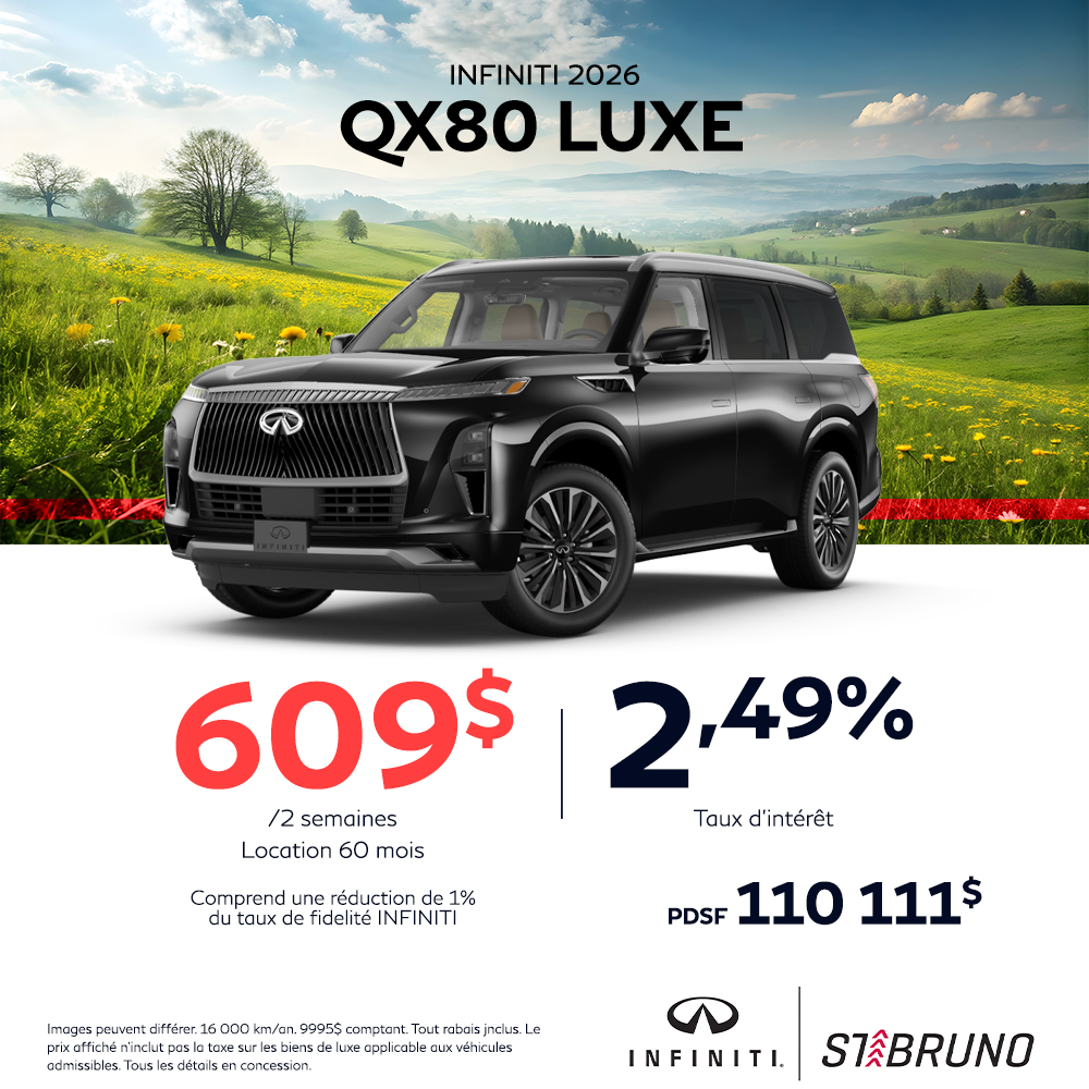 Ce INFINITI QX80 2026 est disponible chez St-Bruno Infiniti à Saint-Basile-le-Grand. Contactez notre équipe des ventes ou venez nous visiter au 221 Blvd. Sir-Wilfrid-Laurier pour obtenir plus d'informations, en faire l'essai ou le réserver.